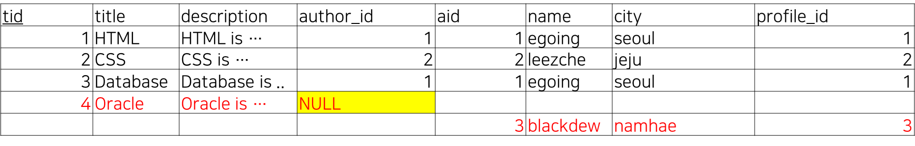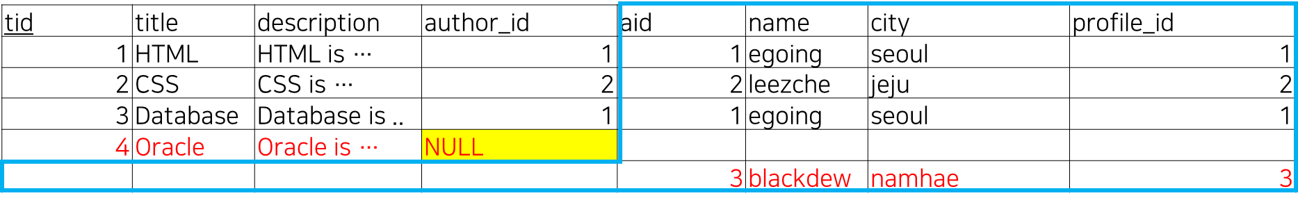 - LEFT/RIGHT JOIN은 자기한테 존재하는 것을 모두 가져온다. 자신과 링크가 걸려있지 않는 것은 NULL로 표현하여 가져온다. Oracle에 있는 NULL은 [author] 테이블에 해당되지 않지만, NULL로 표현해서 가져온다.