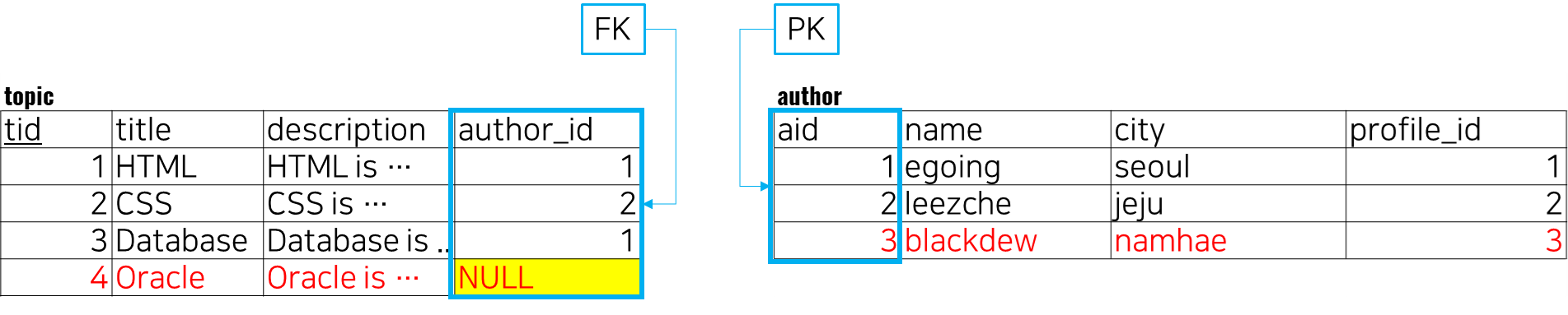 - 여기서 author.aid가 PK가 되고, 그 컬럼을 참고하는 topic.author_id가 FK가 된다.