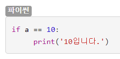 코드 블록: 파이썬에서는 들여쓰기를 기준으로 코드 블록을 구성한다. (같은 블록은 들여쓰기 칸 수가 같아야 한다.)