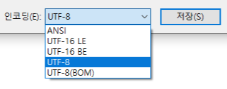 메모장에서 UTF-8로 저장하는 법:파일 > 다른 이름으로 저장 > 인코딩(E)에서 UTF-8 선택 후 저장