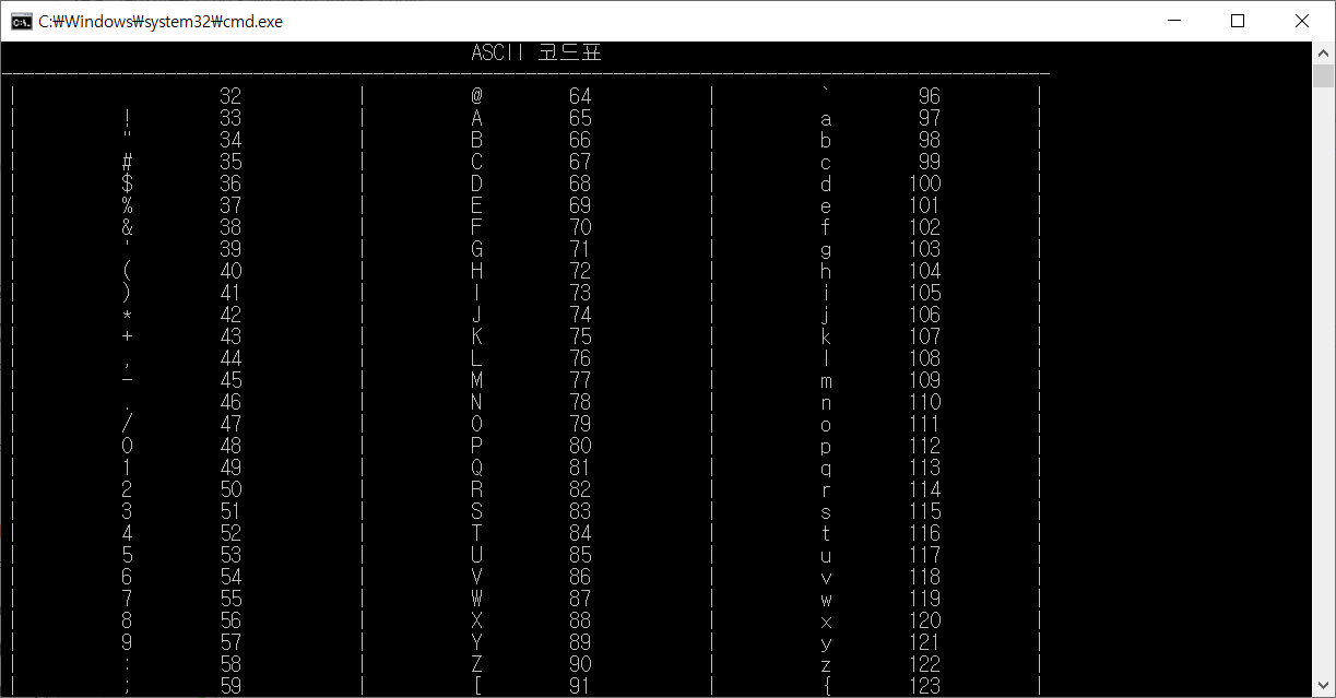 cout << "|" << setw(10) << (char)i << setw(10) << i << setw(10) << "|" << "\t";