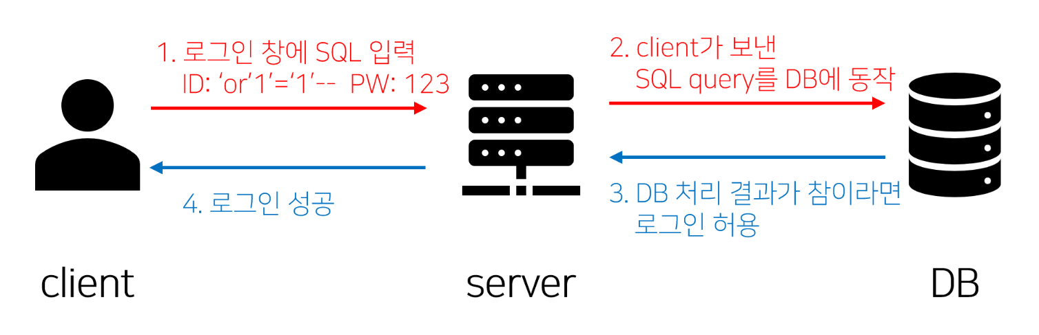 웹 어플리케이션의 뒷단에 있는 DB에 질의(쿼리)하는 과정 사이에 일반적인 값 외에 내용을 변조하는 악의적인 의도를 갖는 구문을 함께 삽입하여 공격자가 원하는 SQL 쿼리문을 실행한다.