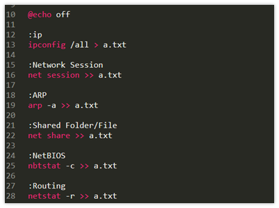 해당 배치 파일은 cmd 명령어로 수집된 결과를 a.txt 파일에 저장한다.