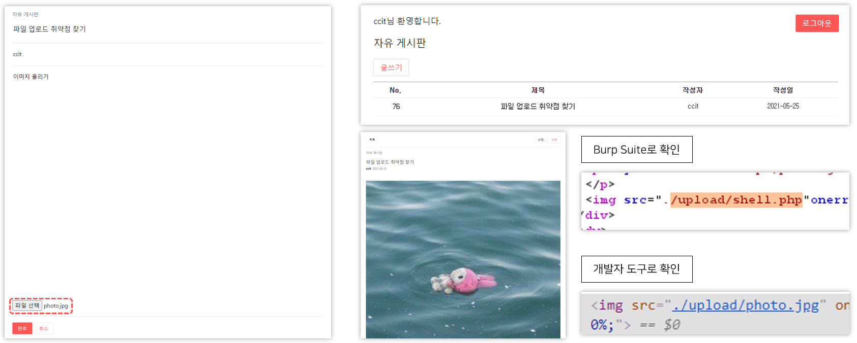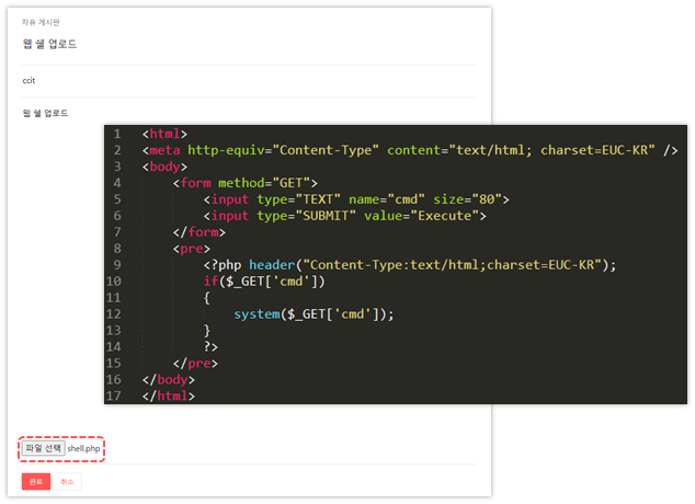 파일 업로드 기능이 존재하는 웹 사이트의 확장자 필터링이 미흡할 경우, 공격자가 악성 파일을 업로드하여 시스템을 장악할 수 있는 취약점이다.