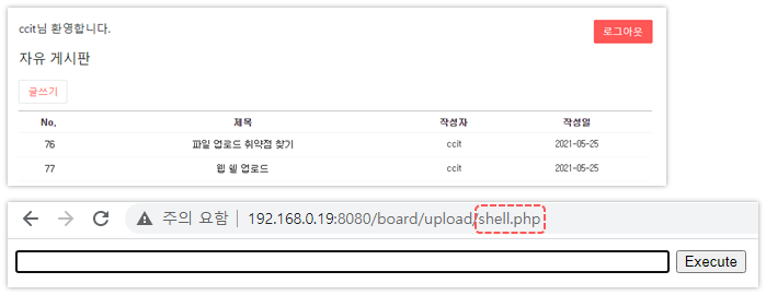 웹 쉘을 통해 호스트 PC에 파일 업로드를 통해 파일이 정상적으로 올라갔는지 확인한다. (위 사진 중 호스트 PC 화면은 내가 구성한 게시판이었기 때문에 서버 입장에서 확인할 수 있다.)