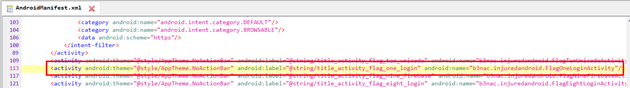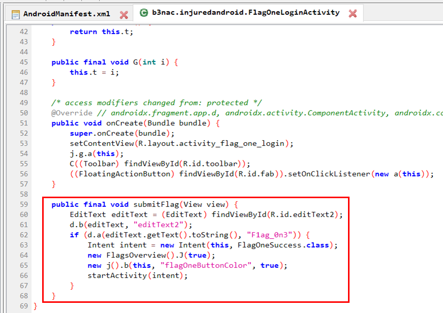 AndroidManifest에서 1번 문제의 코드가 적혀있는 FlagOneLoginActivity 파일을 확인해본다.
