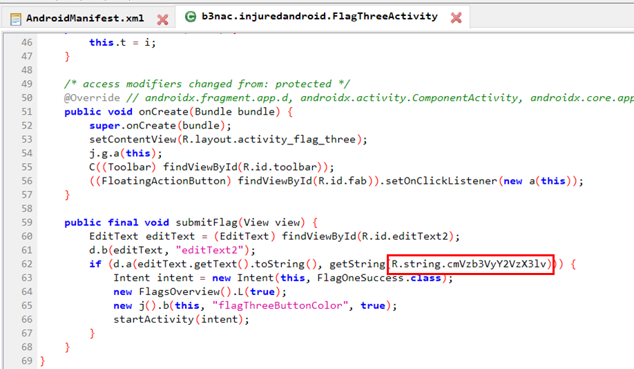 1번과 마찬가지로 FlagThreeActivity 파일을 열어보면 다음과 같이 플래그가 들어가있는 자리에 cmVzb3VyY2VzX3lv 값이 들어있다.