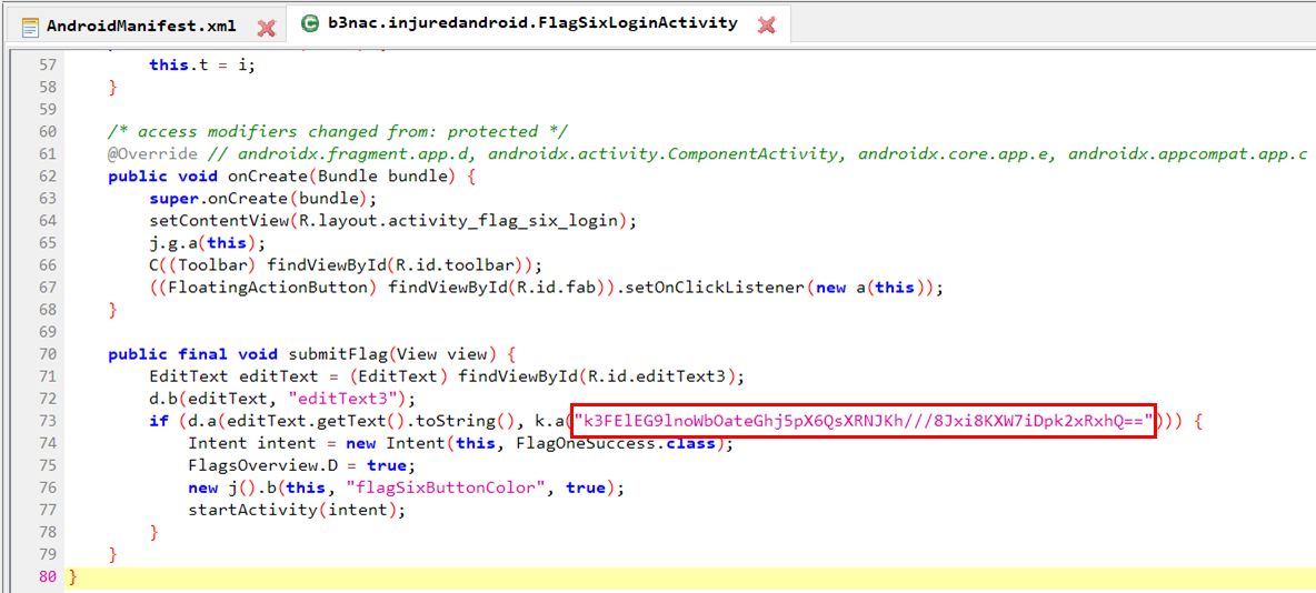 FlagSixLoginActivity 파일을 확인해보면 73번 라인에서 k.a() 함수에서 반환된 값과 비교한다.