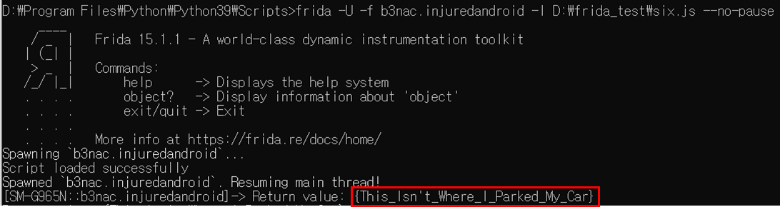 frida -U -f b3nac.injuredandroid -l [자바스크립트파일] --no-pause